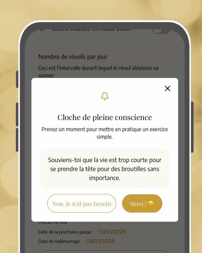 La cloche de pleine conscience vous permet de programmer 3 à 5 réveils aléatoires dans un intervalle de journée défini à l’avance. Ces réveils ont pour intention de vous permettre de vous rappeler à l’essentiel alors que vous êtes dans votre journée en train de faire vos activités. Quel est le souhait le plus profond de notre cœur ? Quelle est notre aspiration dans cette vie ? Qu’est-ce qui compte le plus ? Qu’est-ce qui est le plus important ? Voici les questions que nous invite cette cloche à nous poser plusieurs fois par jour. Cela ne change rien à ce que nous faisons mais cela change tout à notre manière de le faire et de le percevoir.