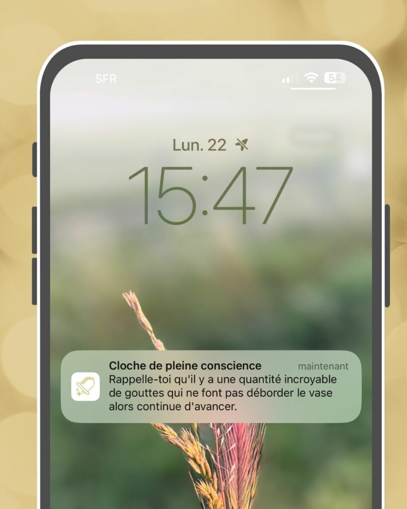 Pour faciliter cette gymnastique intérieure, vous allez voir apparaitre une notification sur l’écran de votre téléphone lorsque la cloche sonne. Si vous cliquez sur la notification, vous allez accéder à un exercice, une inspiration écrite, une question ou une vision afin de vous faciliter le rappel à ce qui est le plus important pour vous à cet instant. Il est alors demandé de passer 3 à 5 minutes concentré en direction de ce qui compte pour vous. Vous pouvez pour cela poursuivre l’activité que vous étiez déjà en train de faire en vous concentrant sur le support de votre choix. Le support peut être à l’intérieur de nous : notre respiration, une sensation, une odeur, un mouvement, une méditation, une prière… Mais il peut aussi être à l’extérieur de nous : une plante, un animal, un enfant, un objet, une pratique… Ce n’est pas le support qui compte le plus, ce qui est essentiel c’est de vous rappeler de votre vision. Le support de concentration est juste un ustensile pour vous apprendre à la maintenir.