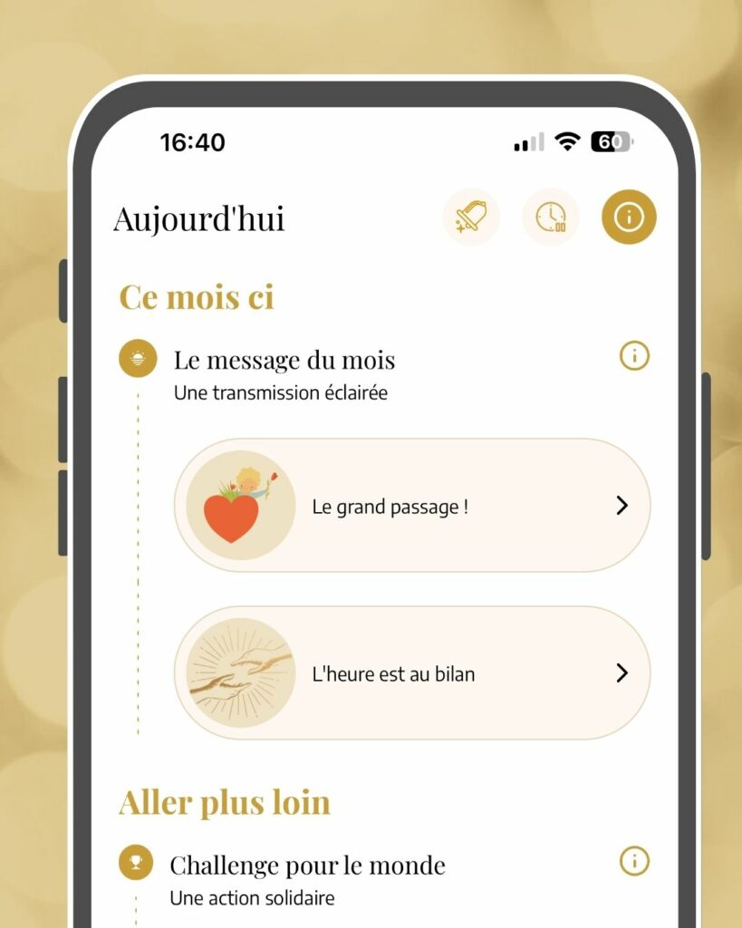 Enfin, un challenge est proposé une fois par mois. Il s’agit ici d’apprendre à réaliser une action désintéressée. Ce challenge est un don que vous offrez au monde à travers votre action. Tous les mois, de nouvelles actions sont proposées en ce sens. S’ouvrir à la dimension du don, du partage et de l’amour est un pilier de l’application mobile.